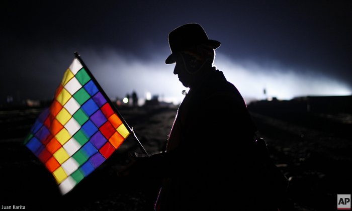 Today. An Aymara man holds a #Whiphala, flag of the people of the Andes. Spotted by chroniclers in the 1500s.pic.twitter.com/Z7ftm07TMd