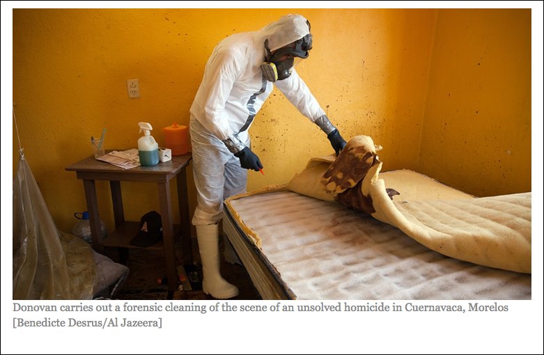 Mexico has one govt. certified forensic cleaner - just one - his name is Donovan Tavera http://www.aljazeera.com/indepth/features/2016/08/meet-man-cleaning-mexico-murders-160811074403935.html …pic.twitter.com/vCP9KJRQXf