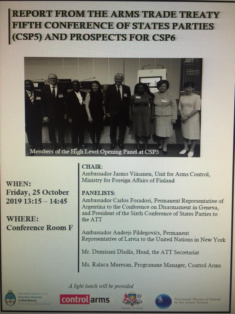 All welcome to attend a side-event on #ATT Arms Trade Treaty Report from CSP5 and Prospects for CSP6 on 25 October 2019 featuring