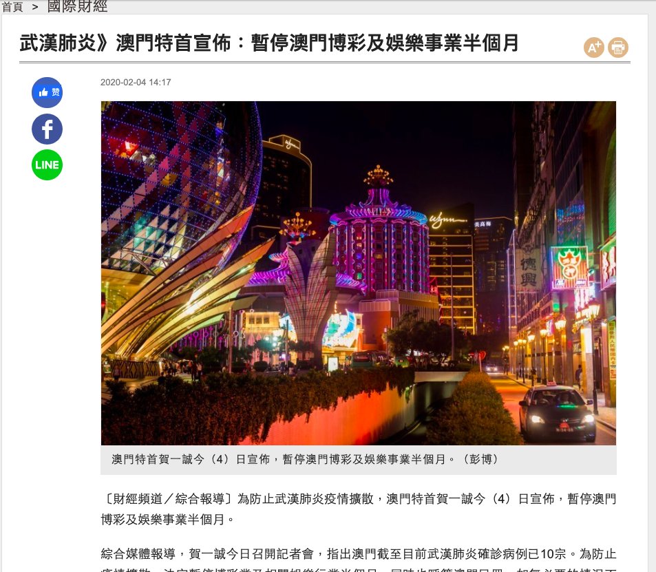 北京时间2月4日下午14:00,也就是本推之前22分钟,澳门特首宣布,全澳门赌场关门歇业半个月!pic.twitter.com/N8pKGBYHuL
