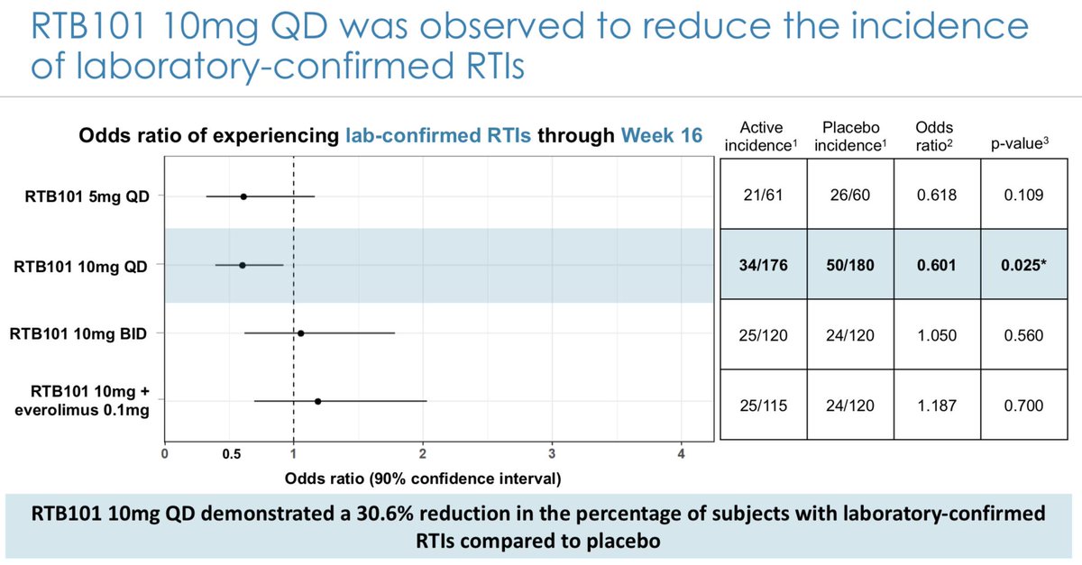 $TORC data slide - placebo for the 10mg arm is ~27% incidence, but placebo drops to ~20% in 10mg BID arm (same as treated). There's also a 2x difference in RTIs between placebo to 5 mg QD and placebo to 10 mg BID. Does anyone have a best way to interpret?pic.twitter.com/ompFsRgApB
