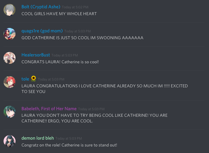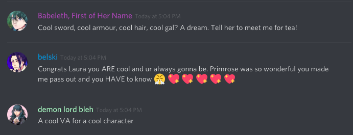 @LauraPostVoice Hi, Laura! @wendows_xp isn't here right now, but we still wanted to send our love! We're all super excited meet the Devout Knight of Seiros, Catherine! So, on behalf of our #FireEmblemThreeHouses server, Congratulations!pic.twitter.com/m1woprs2Vo