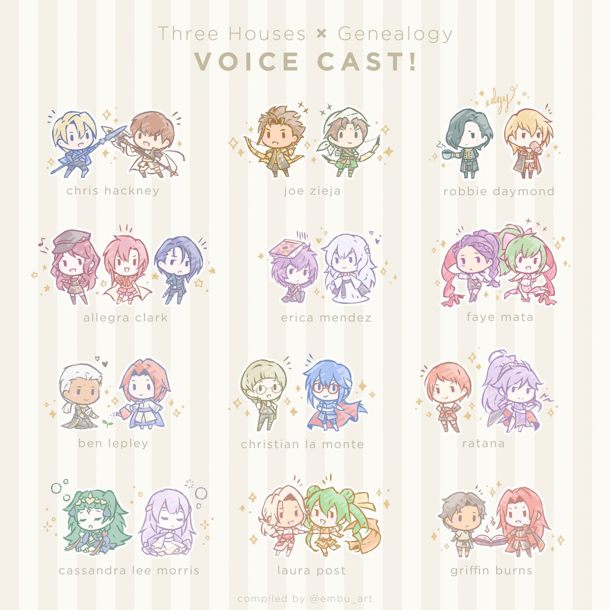 visual guide of Three Houses x Genealogy english voice cast ✨ If you’re a Jugdral nut like me, you’ll notice that much of the voice cast for #FireEmblemThreeHouses also voice many Genealogy character in Heroes! Looking forward to hearing all their beautiful voices in 3H ~ 🥰pic.twitter.com/zEIH0pgDYA
