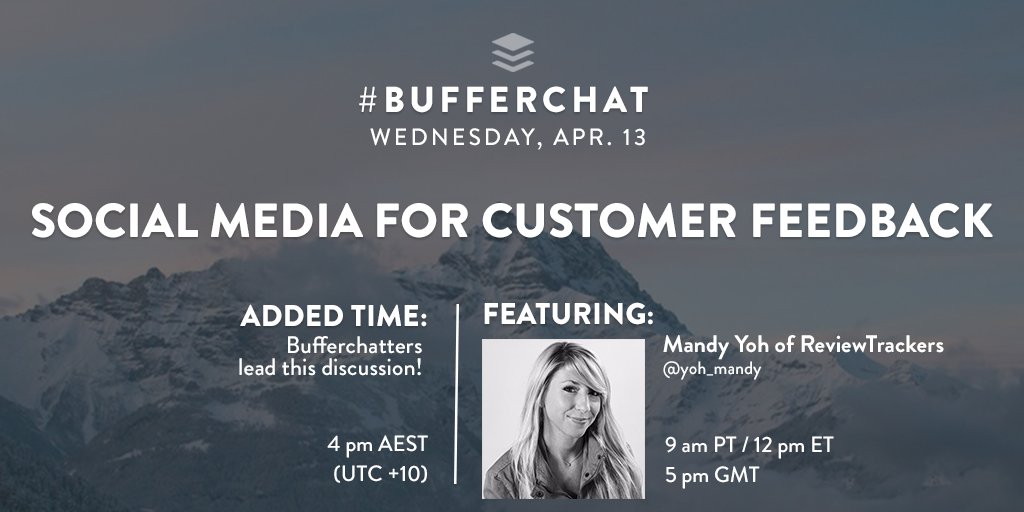 #bufferchat, we're chatting about using social media for customer feedback, w/ guest@yoh_mandy!pic.twitter.com/uwRXcDhze4