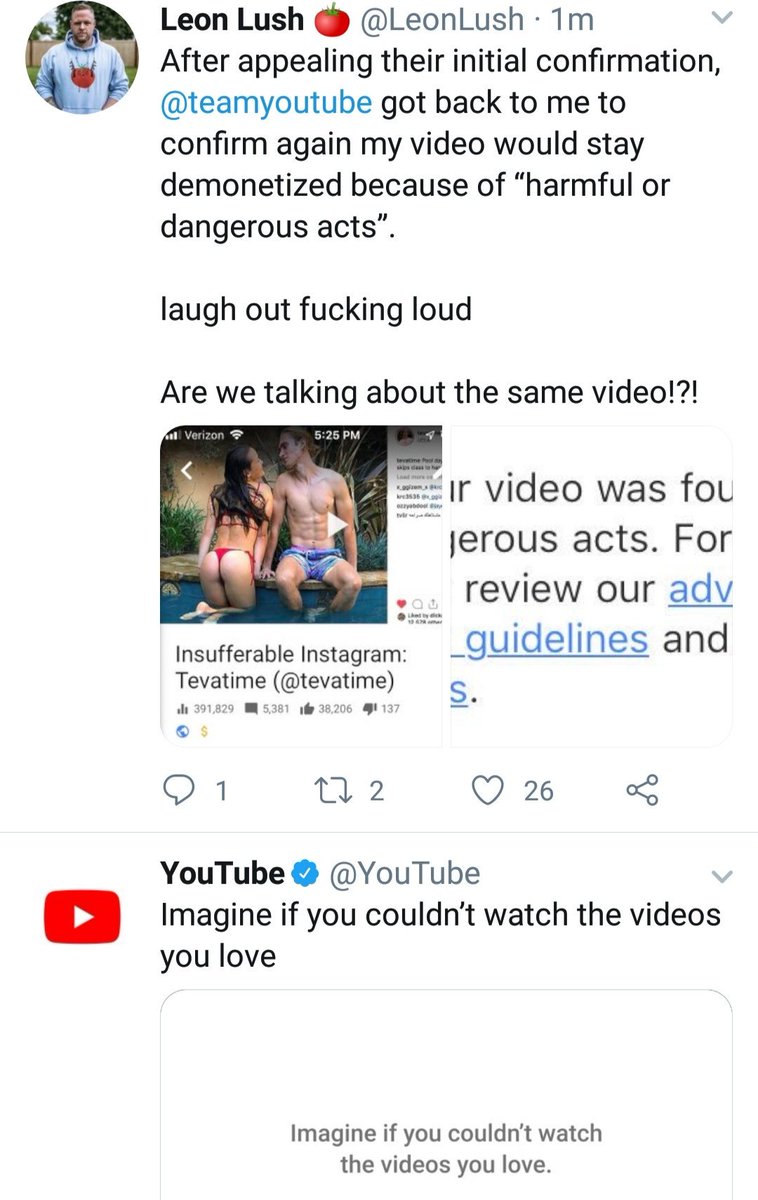 After appealing their initial confirmation, @teamyoutube got back to me to confirm again my video would stay demonetized because of “harmful or dangerous acts”. laugh out fucking loud Are we talking about the same video!?!pic.twitter.com/fe2rRJOojI