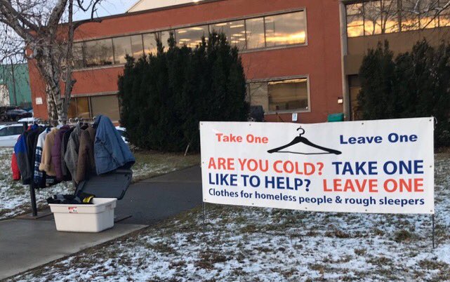Last winter, as freezing temperatures hit London, we put a clothes rail outside a church with a sign reading: "If you're cold, take one. If you can help, leave one." This winter, there are 30+
