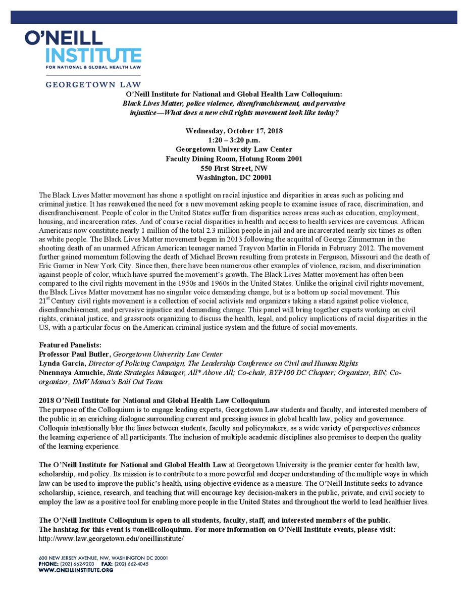 Join us today @GeorgetownLaw for #ONeillColloquium, 1:20-3:20pm #BlackLivesMatter