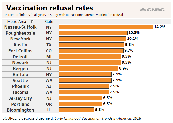 Nassau-Suffolk, NY has highest parental vaccine refusals in US (14%). Nat'l refusal rate is 3%. 2 other NYC areas round out top 3. NY is supposed to lead nation in ph, yet it has far too lax laws, w/ broad religious out-outs. Time for serious law reform! https://www.cnbc.com/2019/03/28/heres-where-parents-are-refusing-to-get-their-children-vaccinated.html …pic.twitter.com/N1w1ZvWCBk