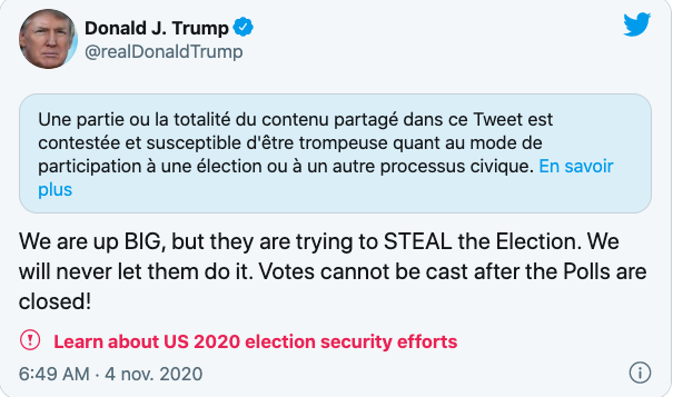 D. Trump twitte sa potentielle grande victoire. Twitter lui met un avertissement. J. Biden twitte sa potentielle grande victoire. Twitter approuve sans avertissement. L'oiseau libre de Twitter est définitivement rentré en cage "politiquement correcte"!.