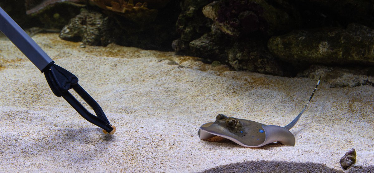 Notre aquarium récifal accueille désormais une jeune raie masquée à points bleus, née en novembre au @burgerszoo. Avez-vous remarqué ses deux aiguillons ? Ils lui permettent, en cas de danger, d’injecter un douloureux venin.