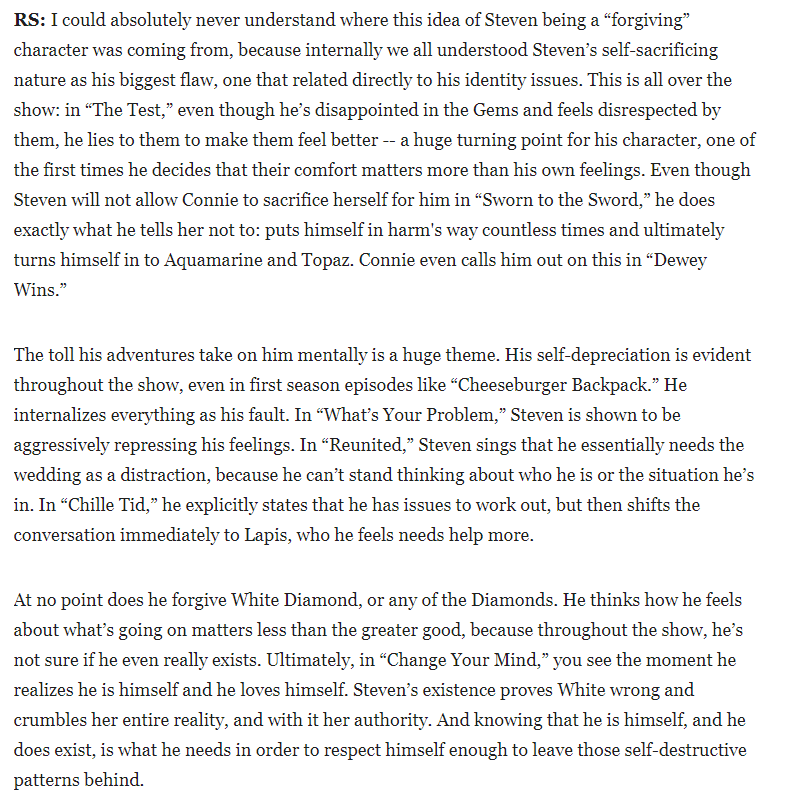 So essentially Steven doesn’t need to form a relationship with the Diamonds, but he is learning post-finale how to let go of his corrosive feelings. Forgiveness is almost purely for the self and not for the other in that regard