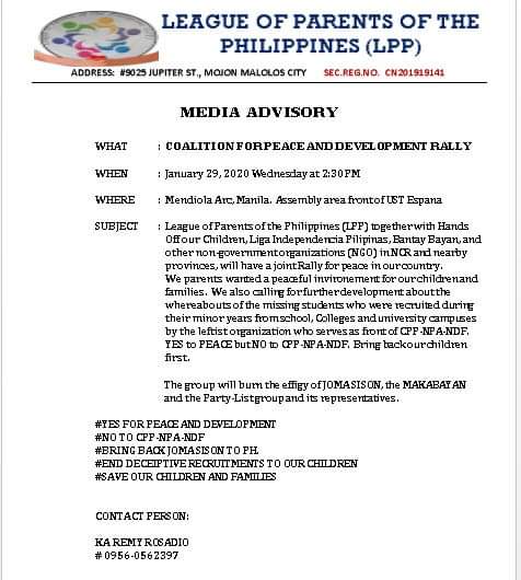 League of Parents of the Philippines and Hands Off our Children rally at Dole...Mga magulang nananawagan Ibalik muna ng mga communist group ang mga kabataan na nirecruit nila bago Peace talkpic.twitter.com/VcKMCLKb3C