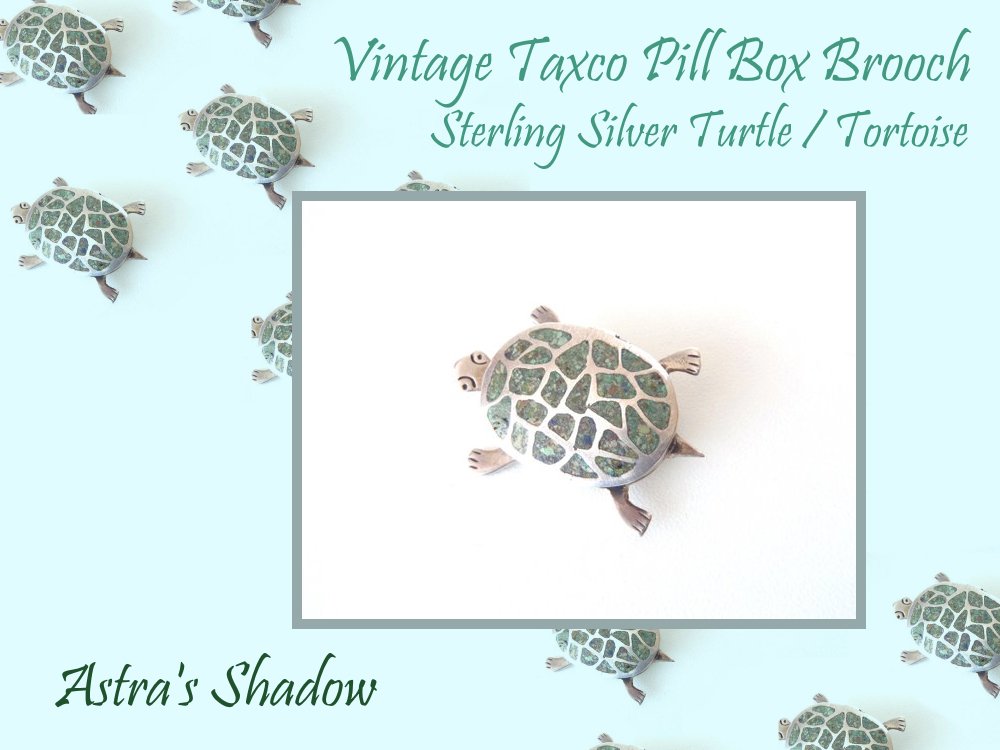 Vintage Taxco Pill Box Brooch Sterling Turtle / Tortoise—Crushed Stone in Resin Inlay on Silver Pillbox Hinged Shell Back w/ Catch Opens http://www.etsy.com/listing/666584619 …