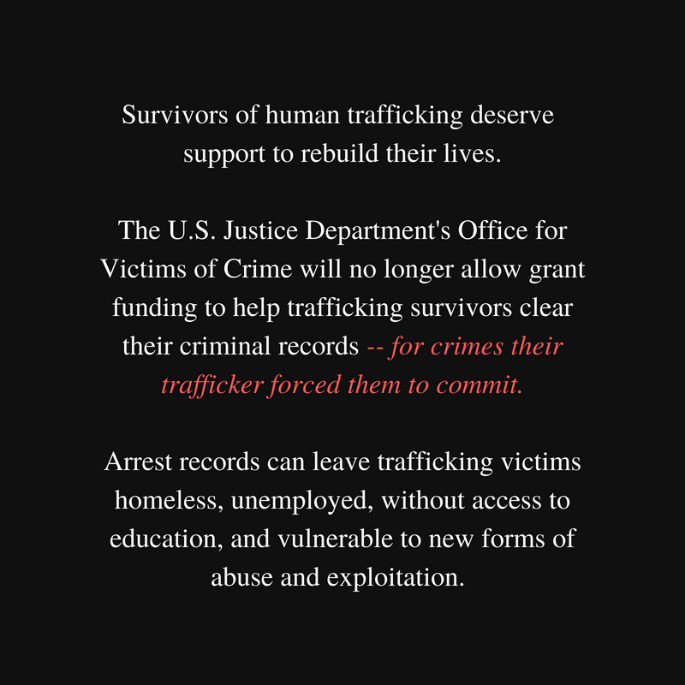 Horrible policy change will deny #humantrafficking survivors access to legal services that help them clear unjust criminal records and achieve independence, safety and stability. @OJPOVC should provide funding that helps survivors move their lives forward. http://bit.ly/FNUSAVacatur pic.twitter.com/8UaVz8Qlv7