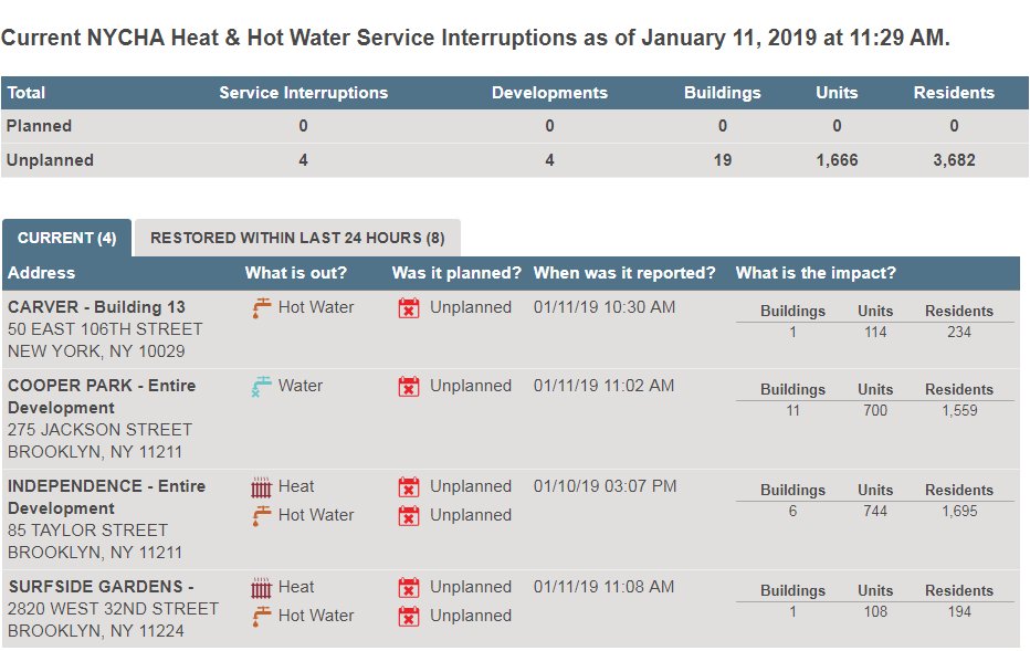 Over 3,600 @NYCHA residents are without working heat and/or hot water right now at developments in Manhattan and Brooklyn. It's currently 28 degrees outside right now. #RefundTheRentpic.twitter.com/ZaZo06zvpd