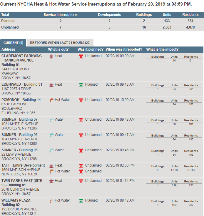 Heat and hot water outages plaguing 4,000 @nycha residents right now at developments in the Bronx, Brooklyn, and Manhattan. It's currently 29 degrees outside.pic.twitter.com/Qbn1IPSpDG