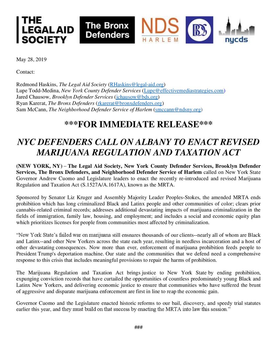 #PressRelease: NYC Defenders Call On Albany To Enact Revised Marijuana Regulation And Taxation Act Cc: @BklynDefender @BronxDefenders @ndsharlem @NYCDefenderS @DPA_NY @CommJusticeLAS @CaseClosedNYC @Kassandra_Fred @mooremelisspic.twitter.com/9w5W63GrDO