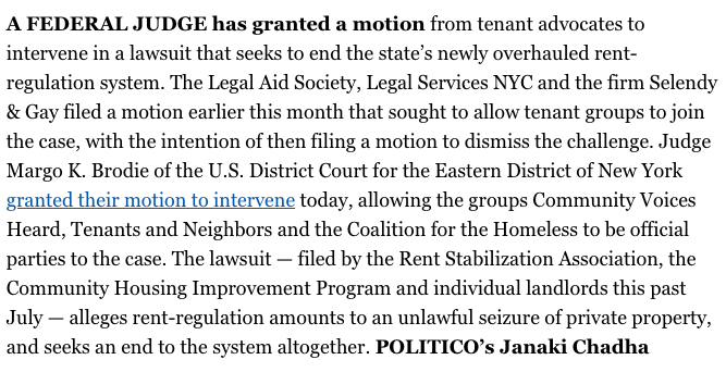 .@politicony: "A FEDERAL JUDGE has granted a motion from tenant advocates to intervene in a lawsuit that seeks to end the state’s newly overhauled rent-regulation system." Cc: @LSNYCnews @selendy @CVHaction @NYHomeless @tenantneighborpic.twitter.com/LP3qjRfGmw