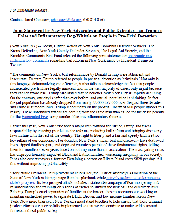 JOINT STATEMENT: Trump's comments on bail reform were abhorrent & inaccurate. In truth, NY took a major step forward for justice, safety & fiscal responsibility. Sadly, while Trump tweets malicious lies, DAASNY is taking a page from his playbook to undermine our state's progress.pic.twitter.com/CuNBLoQbdY