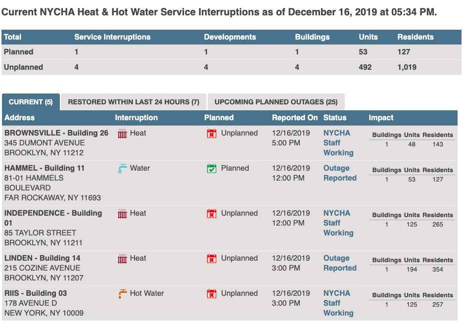 More heat/hot water outages impacting over 1,000 @nycha residents in Queens, Brooklyn and Manhattan.pic.twitter.com/VXM2tYDvhf