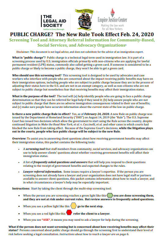 📣ATTN📣: Alongside @MaketheRoadNY & @empirejustice, we are releasing a new version of our Public Charge Screening Tool to address client needs caused by the implementation of the new #PublicCharge rules today. View and download the Screening Tool here: https://bit.ly/39YqPgh pic.twitter.com/b6kshbAJBm
