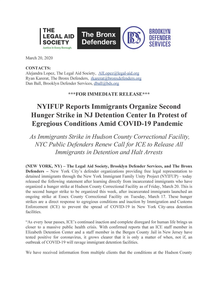BREAKING: #NYIFUP reports a 2nd #HungerStrike by immigrants in NJ detention in protest of egregious conditions amid #COVID19 pandemic.