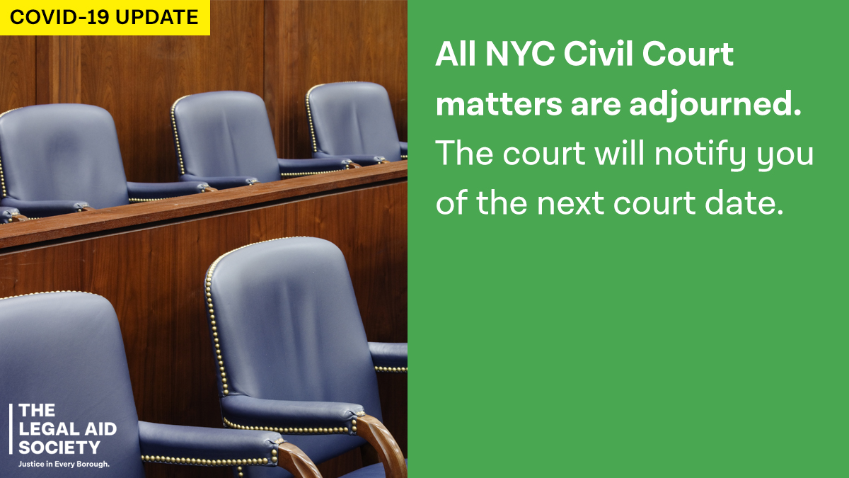 Statute of limitations, time to answer and time to serve legal papers has been extended until further notice. Emergency applications to vacate a judgment, stop a wage garnishment or bank account levy will be heard. https://www.legalaidnyc.org/get-help/covid-19/covid-19-information-for-clients/#civil-court …pic.twitter.com/k23duzRnRt