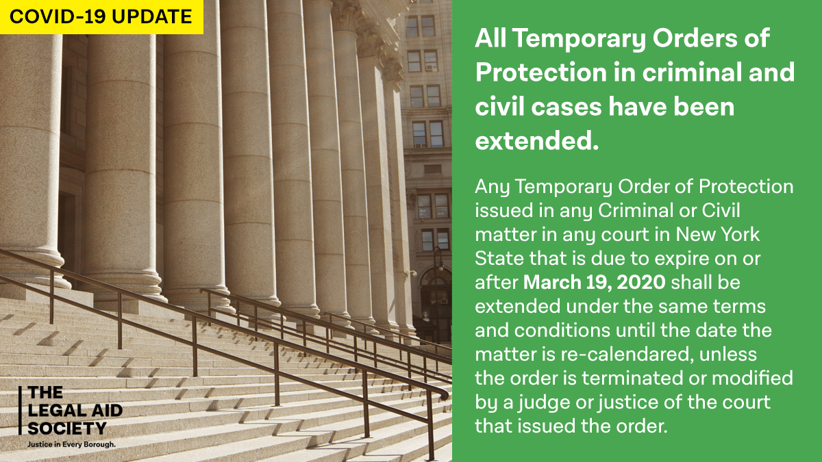 All Temporary Orders of Protection are continued until the next time the case is back in Court. If you have any questions, contact your attorney. https://www.legalaidnyc.org/get-help/covid-19/covid-19-information-for-clients/#new-york-state-courts …pic.twitter.com/1rSXjGFIjp