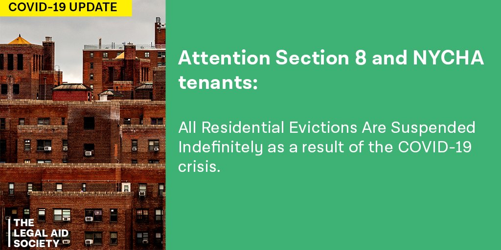 Suspension of evictions, Rent deductions during periods of lost income Repairs Programs for Seniors https://www.legalaidnyc.org/get-help/covid-19/covid-19-information-for-clients/#housing …pic.twitter.com/VGEkqO7DzU