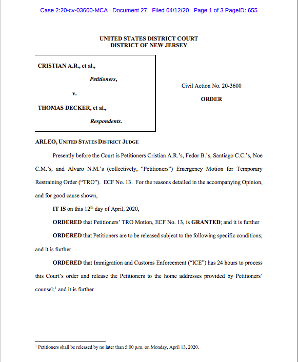 BREAKING: We just won the immediate release of five immigrants in ICE detention who are at high risk of serious illness or death if they contract #COVID19, due to their underlying health conditions.