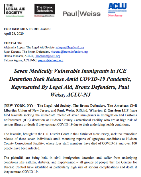 #BREAKING: We're suing ICE for the release of 7 medically vulnerable immigrants in ICE detention at Hudson County Jail—where 4 staff members have died of #COVID19 & over 100 people have been infected.