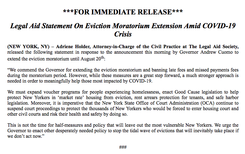 #STATEMENT: In Response to @NYGovCuomo extending the eviction moratorium until August 20th.