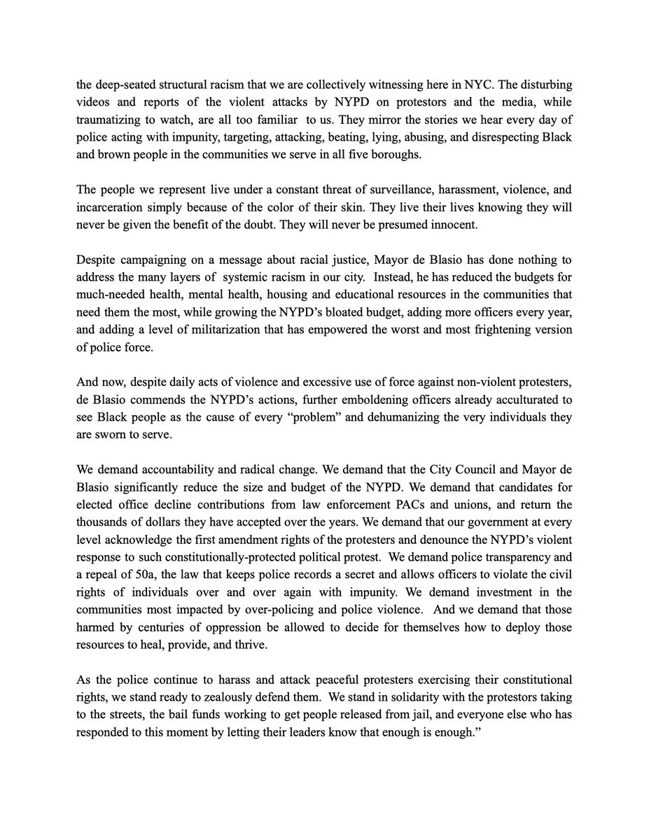 JOINT DEFENDER STATEMENT: "We demand accountability & radical change. We demand that the City Council and Mayor de Blasio significantly reduce the size & budget of the NYPD...As the police continue to harass & attack peaceful protesters, we stand ready to zealously defend them."pic.twitter.com/anjmqJHvQb