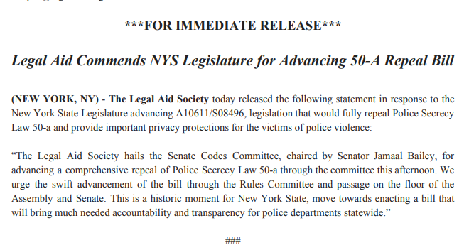#STATEMENT: We commend Senator @jamaaltbailey & the Senate Codes Committee for advancing a comprehensive repeal of Police Secrecy Law 50-a.