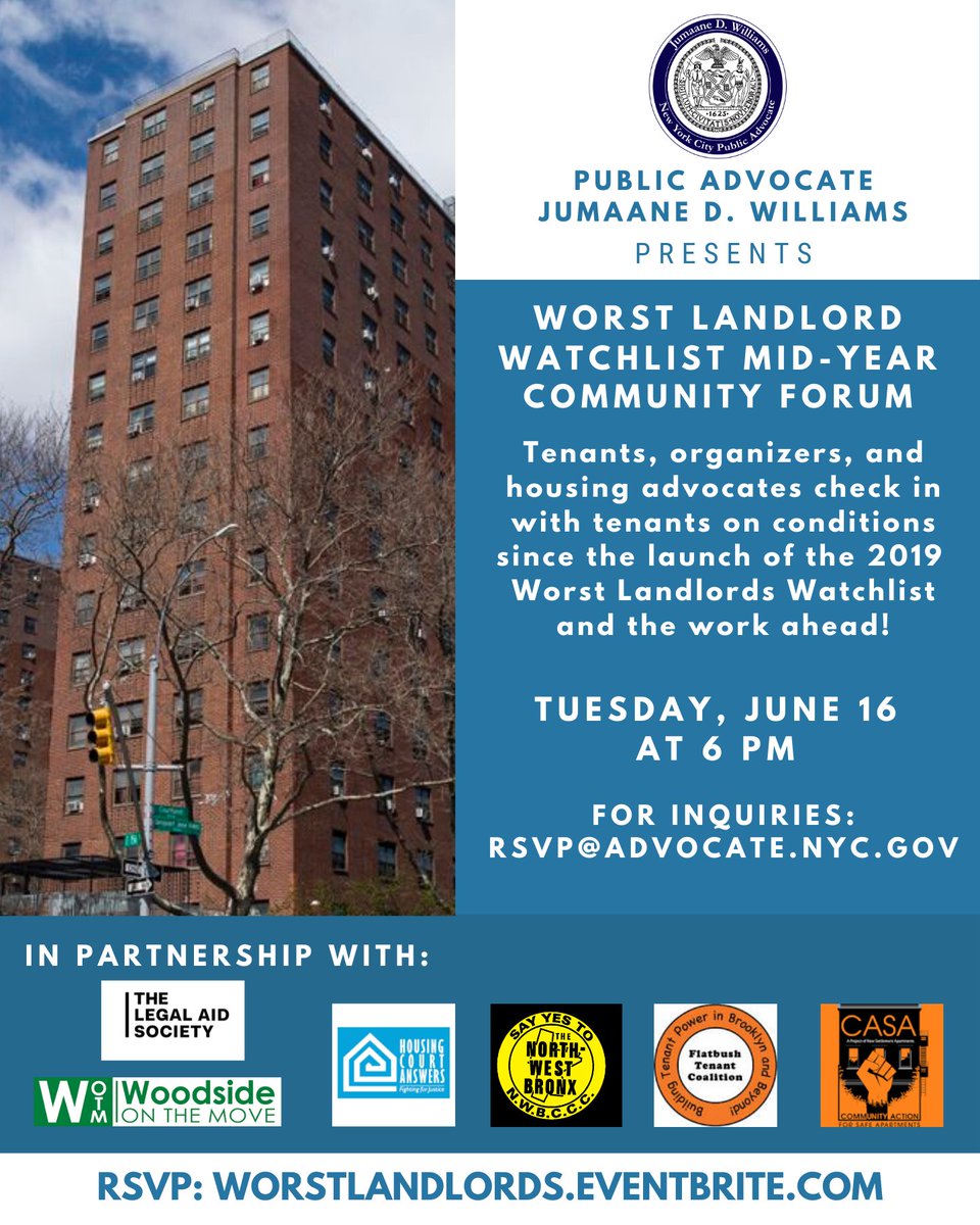 Join @nycpa and fellow housing advocates on Tuesday 6/16 at 6pm via Zoom for the mid-year #WorstLandlordWatchlist community forum.
