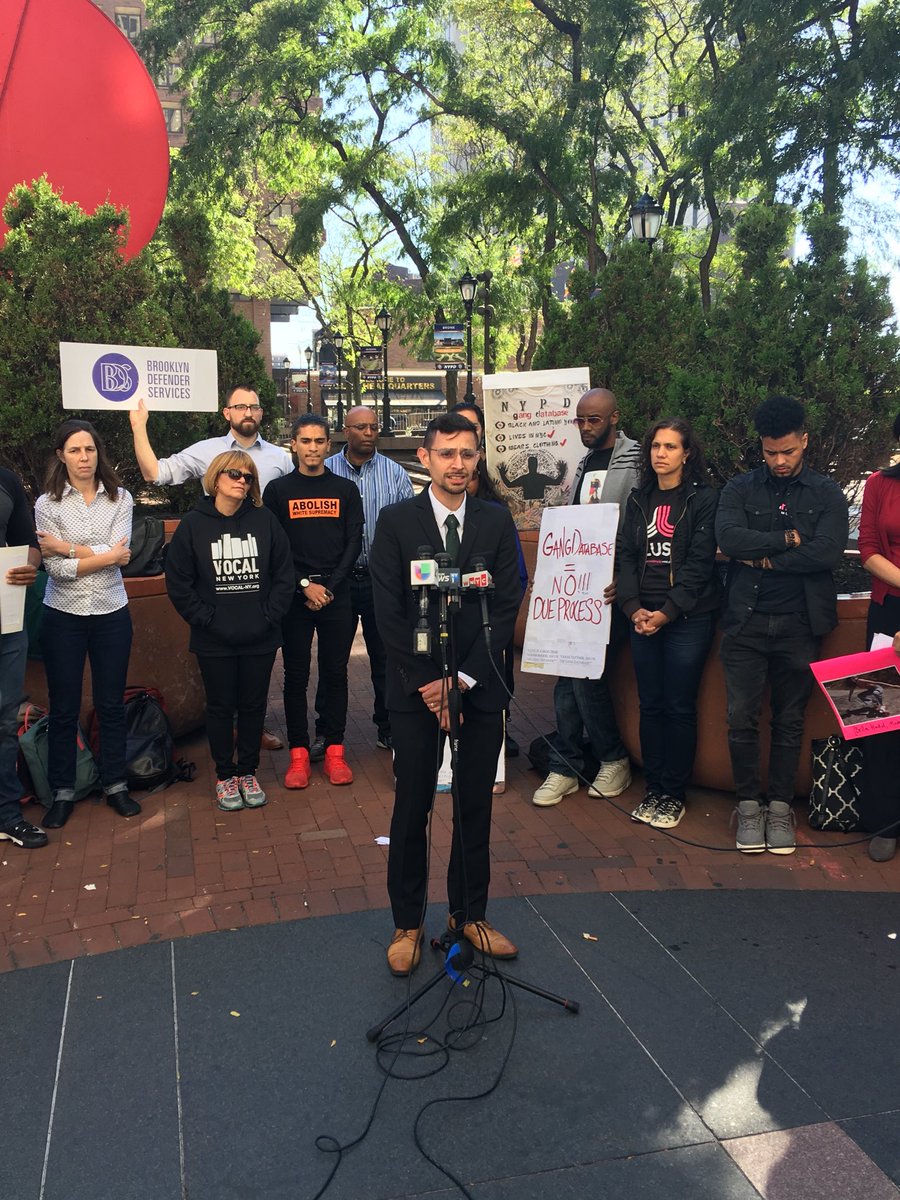 "The #NYPD gang database unfairly targets black & brown NYers leading to jail and deportation," - Anthony Posada.pic.twitter.com/pfCQtwrFOn