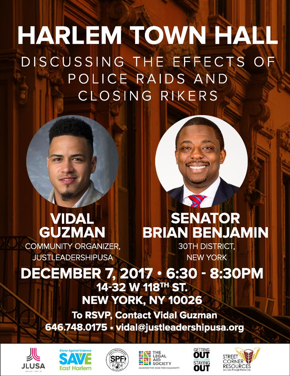 Join us and others on December 7th for town hall discussing the impact of #NYPD raids, and #ClosingRikers. #CommunityJusticeUnit Cc: @JustLeadersUSApic.twitter.com/E4g9GYk8Uh