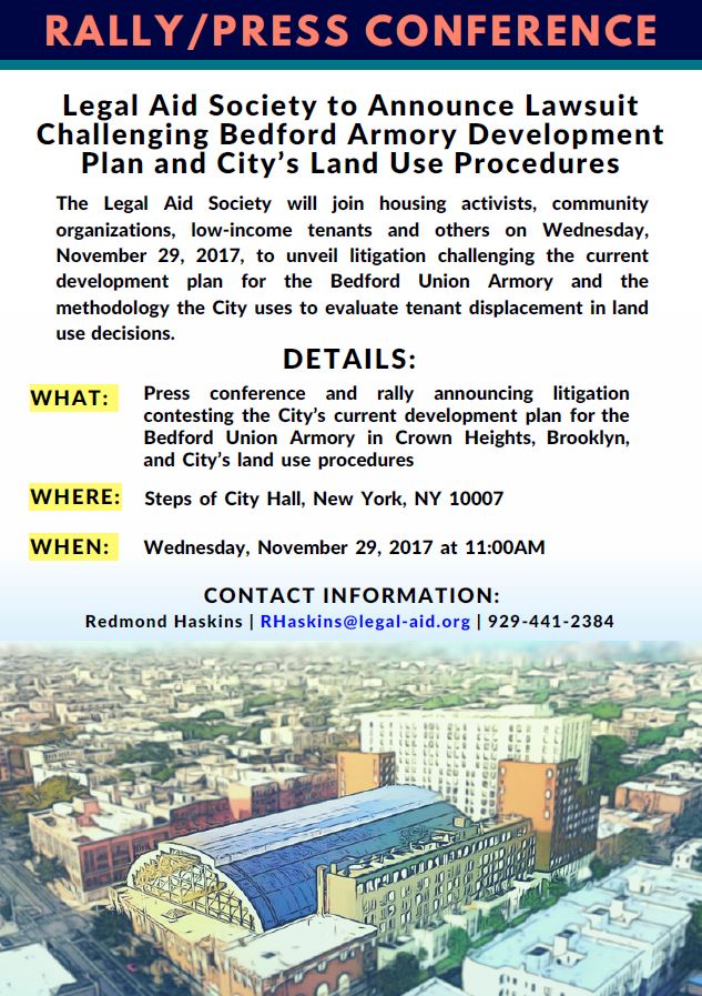 TOMORROW: We're announcing litigation challenging the @nycgov's #BedfordArmory development plan and their flawed land use methodology evaluating tenant displacement. Join us, @nychange, @CHTenantUnion, @tenantneighbor and others at 11 am, steps of City Hall.pic.twitter.com/1qDYayA7j5