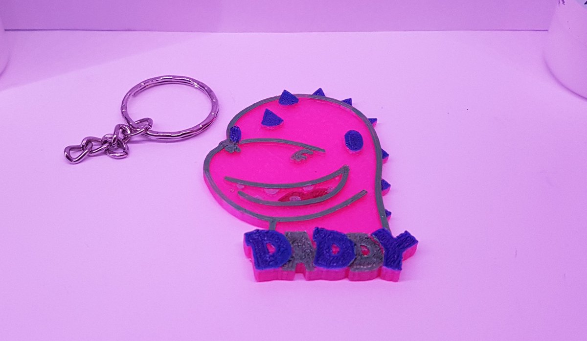 Leo here you go, the test print done of your DinoDaddy Keyring! A bonus surprise.. I'm gonna design a "I've Beans'd It" & BaconBitches one as well All colours are just there for show. I've got some green PLA to use instead of the pink. 😁💜 @Leozaur @TaraNaz_ @MissMousieMousepic.twitter.com/rsm8nWU2v4