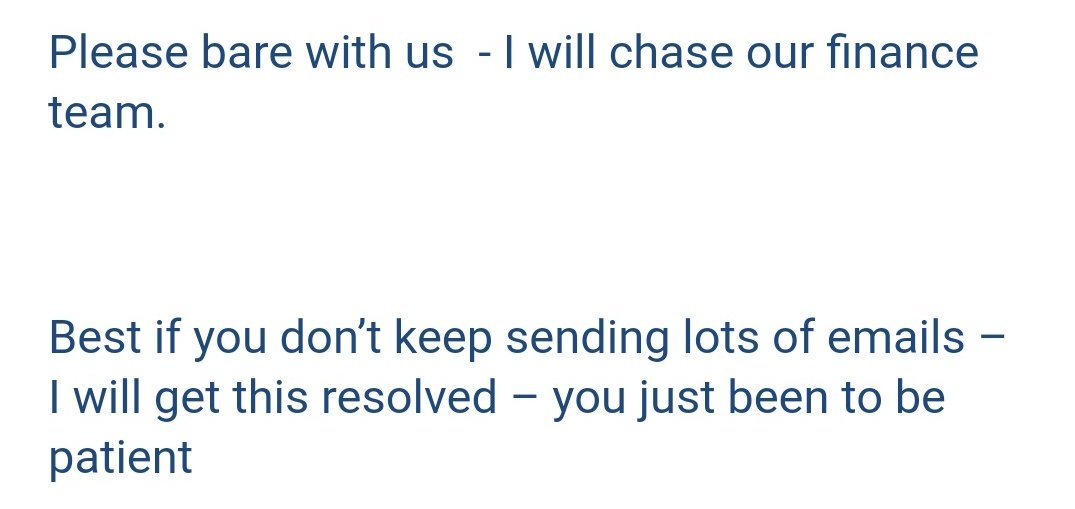 I sent my bank details in June then I chased twice in July (5th and 29th) and now twice in August because it's getting silly. What sort of response is this
