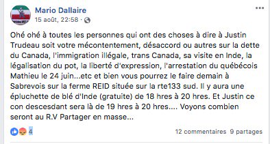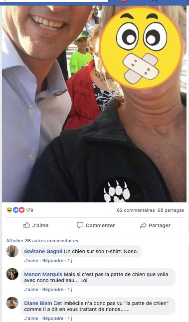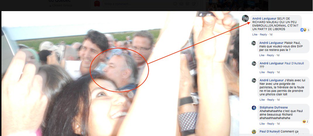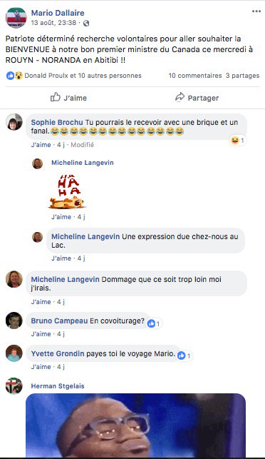Des photos sur le groupe Front Patriotique du Québec montre que ce sont des membres de ce groupes qui étaient présents, pendant que la dame était avec les policiers un autre s'est approché du premier ministre. Sur une autre photo on voit Mario Dallaire être #onestpasracistespic.twitter.com/L0Sglasr0Q