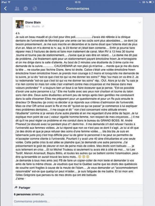 Finalement, Diane Blain est la même personne qui avait refusé de se faire servir par une étudiante voilée à la clinique dentaire de l'UdeM. http://journalmetro.com/opinions/prochaine-station/727569/pas-daccommodement-pour-le-racisme/ …pic.twitter.com/GLfE8vkmG2