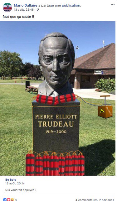 Finalement, notre ami Mario Dallaire publie une photo de Bo Bois (celui à la voiture aux couleurs du PQ) où on fantasme de faire sauter la statue de PET. Alors que Diane Blain explique, sous un vidéo la concernant, que le FLQ n'étaient pas des violents..pic.twitter.com/vxMAkg7NvO