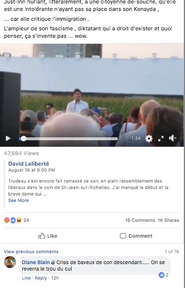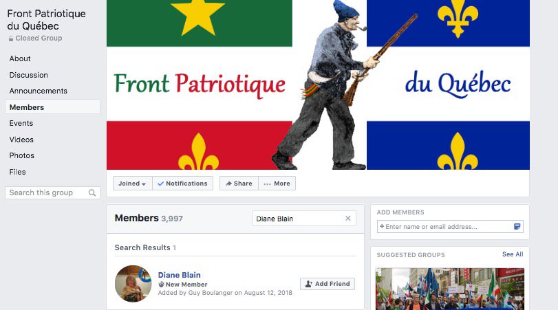 Elle semble être une "angry péquiste" @partiquebecois et aussi, elle est membre du groupe Facebook Storm Alliance, un groupe d'extrême droite.pic.twitter.com/mhi429DYsS