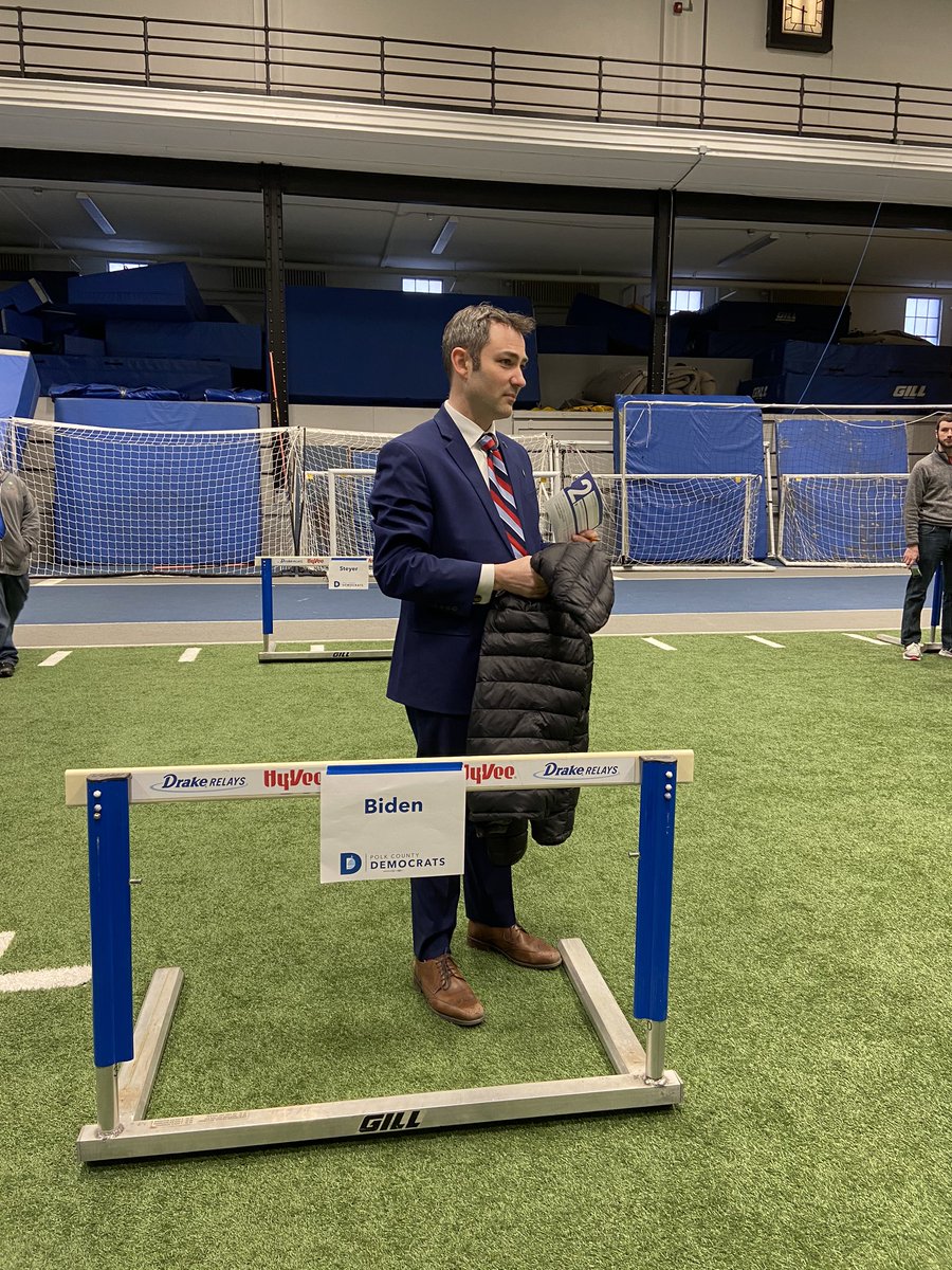 On first alignment at a satellite caucus in Des Moines, there is one Iowan standing near the Biden placard.