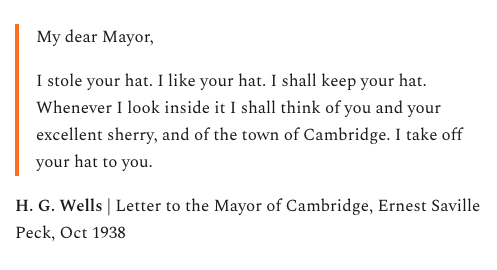 @LettersOfNote https://news.lettersofnote.com/p/i-stole-your-hat-i-like-your-hat?utm_campaign=post&utm_medium=web&utm_source=twitter … What a fun read! Kennedy to Shaw.Thanks. Twitter will use this to make your timeline better. UndoUndo -
