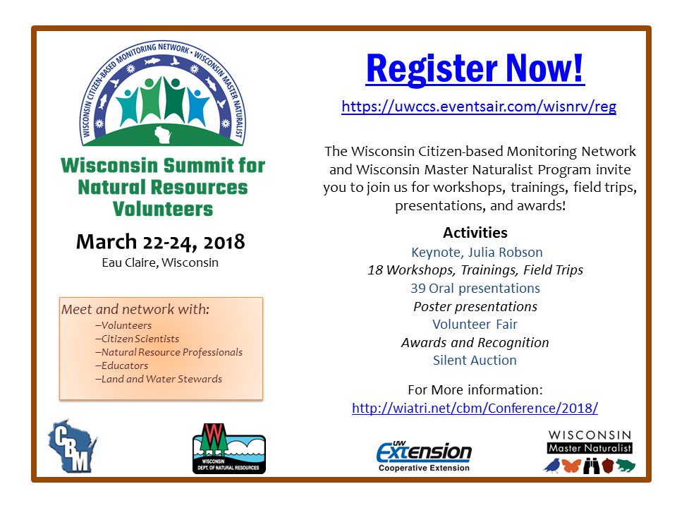#CitizenScience, planting for pollinators, new volunteer opportunities, and more at our upcoming conference. Early Bird Registration ends Feb 9! http://wiatri.net/cbm/Conference/2018/Images/WISNRV_Details.pdf …pic.twitter.com/Dhnc45dqXp