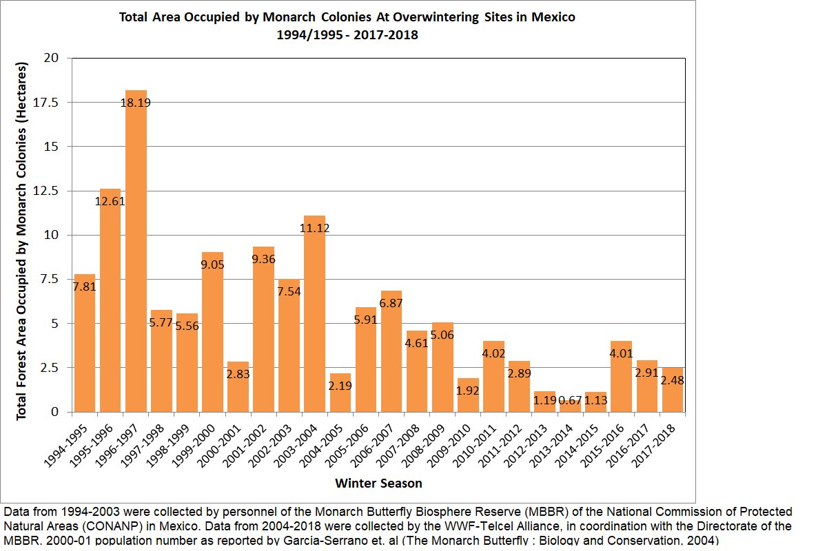 #Monarch#Overwintering Population numbers have been released by@WWF Mexico and CONANP. The population was at 2.48 hectares measured in December 2017, compared with 2.91 hectares recorded in 2016. Find out more: https://monarchjointventure.org/news-events/news/eastern-monarch-overwintering-population-numbers-announced …pic.twitter.com/8Ubcstpz81