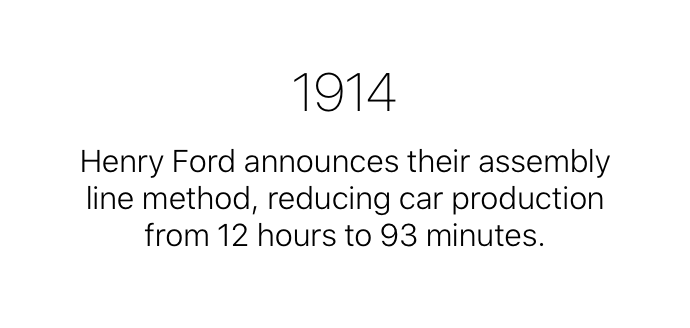 WOW! Henry Ford announces their assembly line method, reducing car production from 12 hours to 93 minutes. ― 1914. Jan 14.
