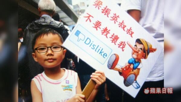 "Uncle Leung, don't teach me bad stuff." RT @hu_jia: @gzdxxd #hk71 身穿背心的曾小朋友拿着写有“梁振英叔叔,不要教坏我”的标语牌跟着妈妈参加7.1游行。(苹果日报图片)pic.twitter.com/F1dBRtU53i